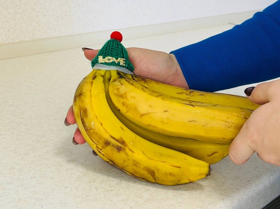 Шапочка для бананов — это не самый распространенный, но интересный гаджет. Она помогает дольше сохранять свежесть фруктов, надеваться на верхушку связки бананов. Одежка из фольги или пищевой пленки сможет выполнить ту же функцию, придавая даже элемент забавности вашему хранению.