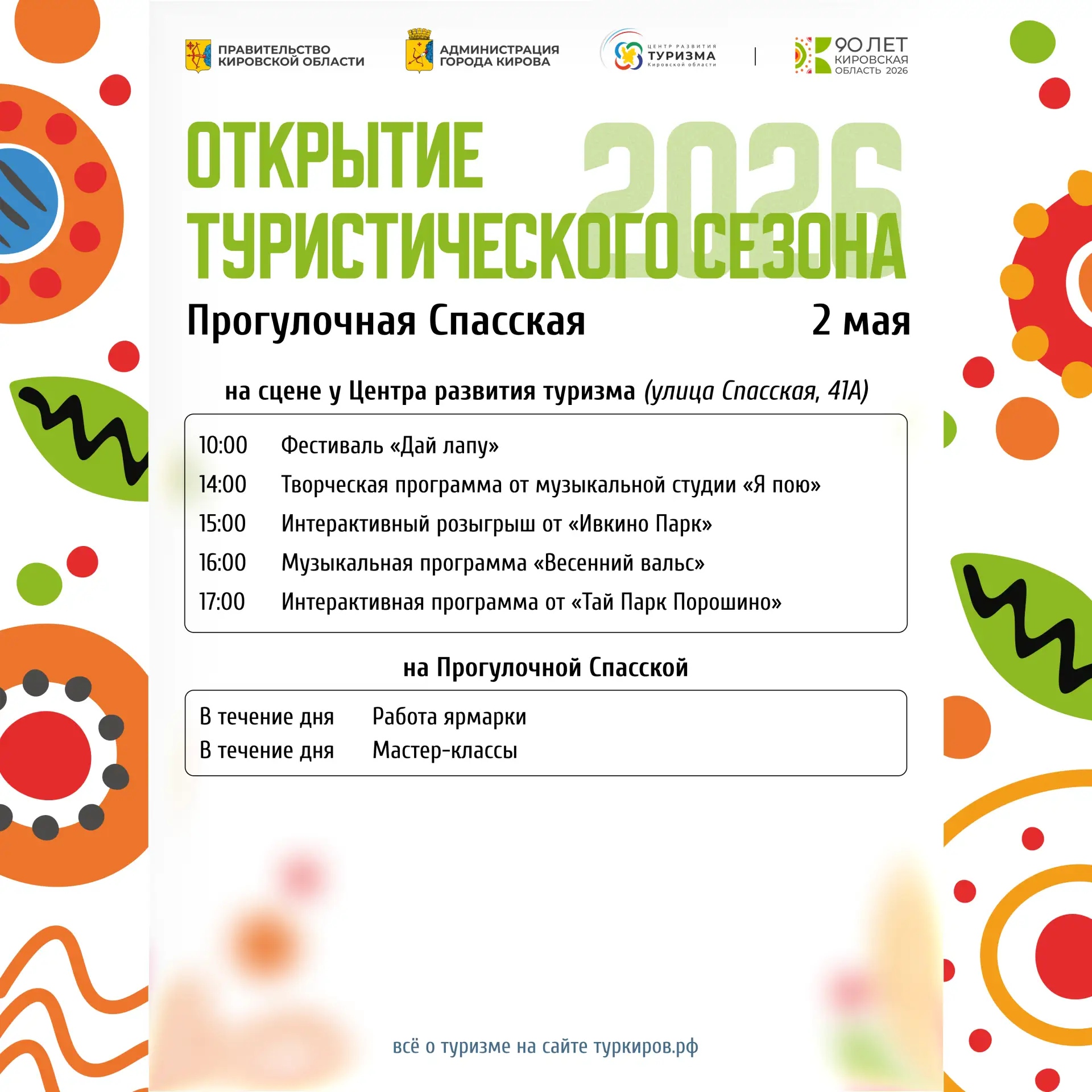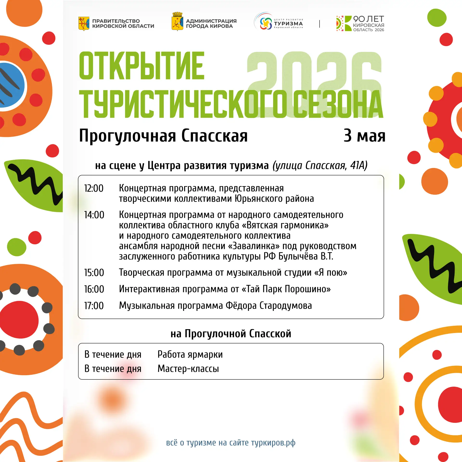 С 1 по 3 мая 2026 в Кирове на Прогулочной Спасской открывается летний туристический сезон. Центральной площадкой мероприятий станет участок от ул. Никитской до ул. Казанской.